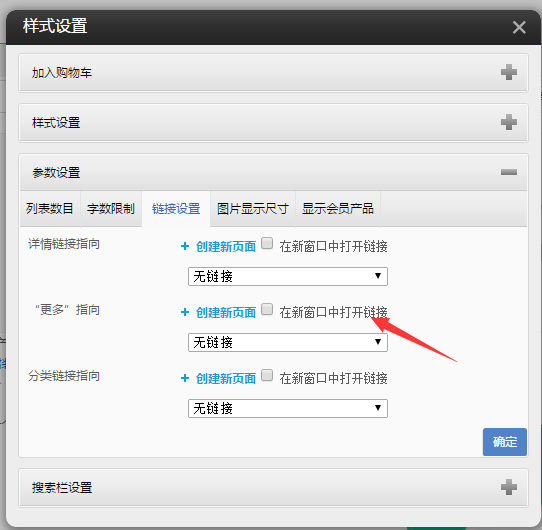 ⑧.需要注意的是,點(diǎn)擊參數(shù)設(shè)置,設(shè)置列表的鏈接指向,如下,需要鏈接到帶有產(chǎn)品詳情插件的頁(yè)面。其余的列表數(shù)目,字?jǐn)?shù)限制,圖片顯示尺寸,顯示會(huì)員產(chǎn)品可自行按需設(shè)置