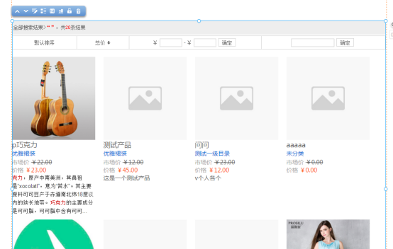 ⑥.產(chǎn)品搜索結(jié)果插件如下:編輯狀態(tài)下,將出現(xiàn)如下的插件,和產(chǎn)品列表的某個(gè)樣式一致。注意,預(yù)覽情況下默認(rèn)該插件是沒(méi)有數(shù)據(jù)的,只能和搜索框聯(lián)配合使用