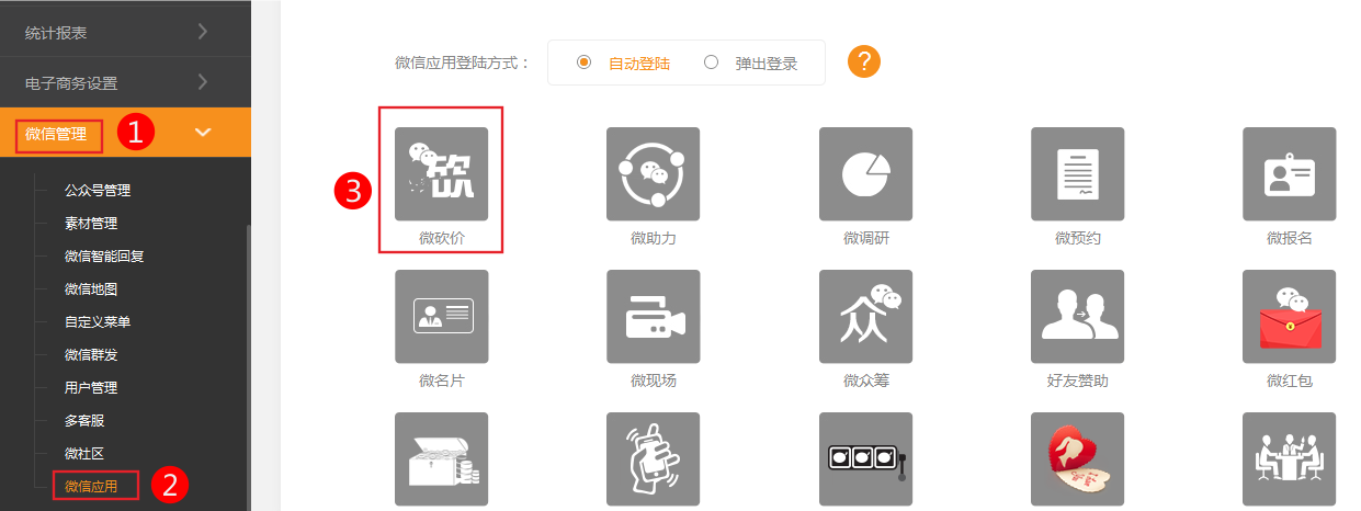 1、依次點(diǎn)擊電子商務(wù)設(shè)置-》微信應(yīng)用-》微砍價(jià)