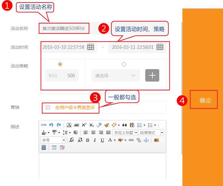2、設(shè)置活動(dòng)名稱、時(shí)間、贈(zèng)送策略、是否在用戶領(lǐng)卡界面顯示,即可生成一個(gè)完整的開(kāi)卡即送活動(dòng)。