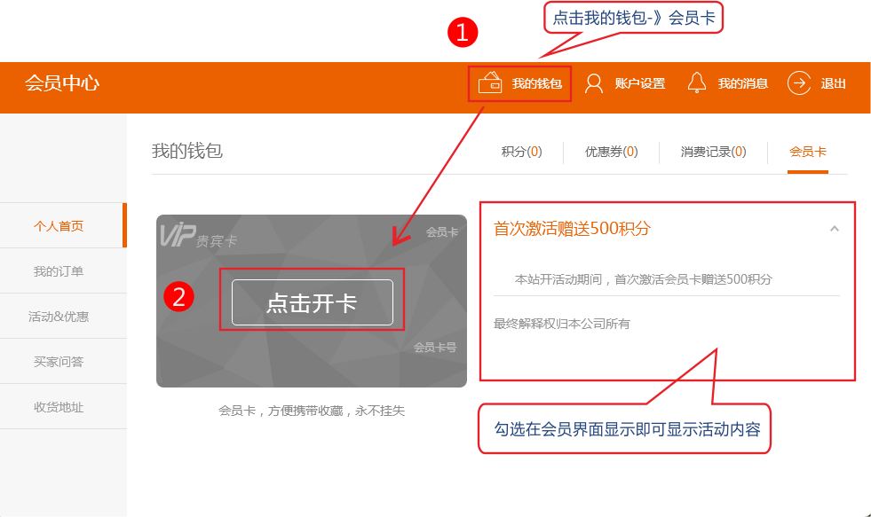 3、在用戶中心-》點(diǎn)擊我的錢包-》會(huì)員卡-》點(diǎn)擊開(kāi)卡后即可獲得到活動(dòng)獎(jiǎng)勵(lì)