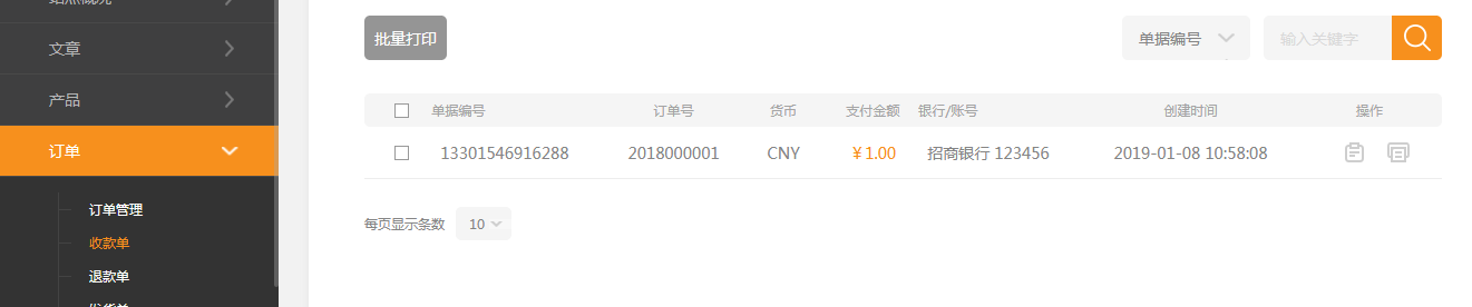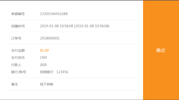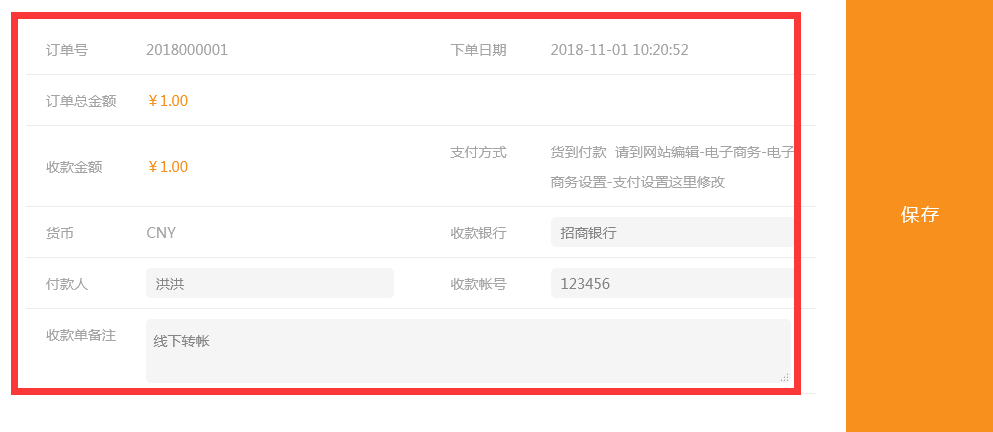 當(dāng)訂單狀態(tài)是未支付時(客戶無法使用網(wǎng)站提供的在線支付接口付款時,通過線下轉(zhuǎn)帳、現(xiàn)金支付等方式收到的款)管理員在訂單中點擊支付后錄入收款信息會生成收款單