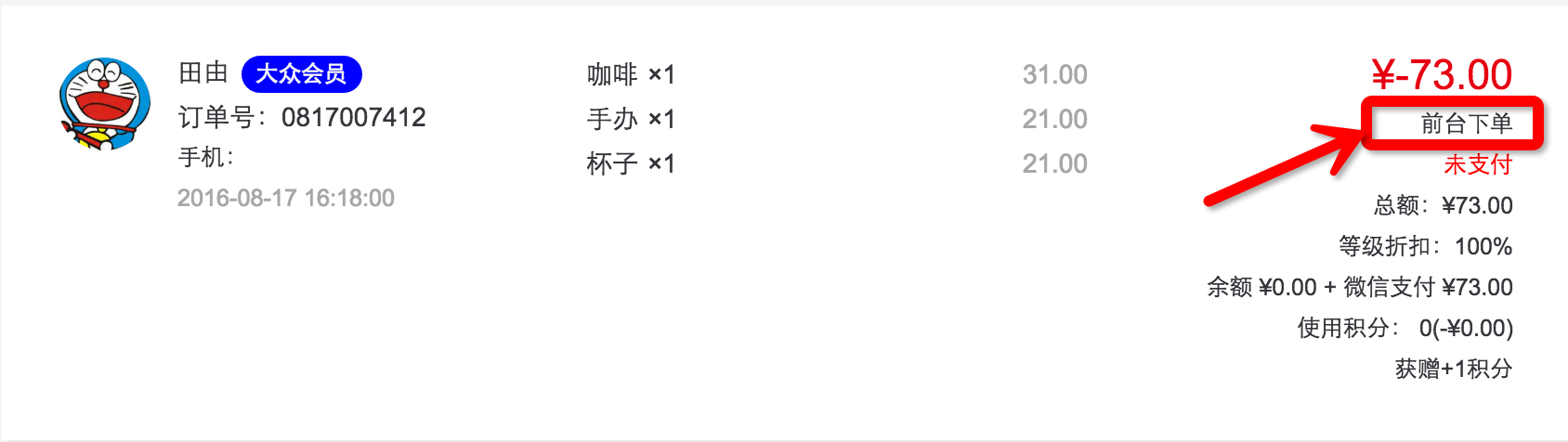 支付成功后后臺將會顯示該訂單信息,并標注為前臺下單