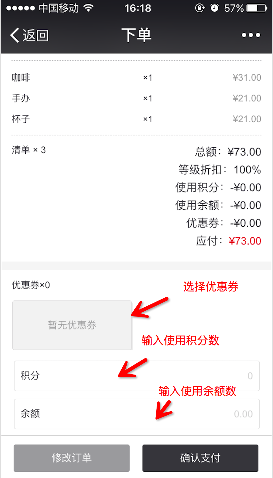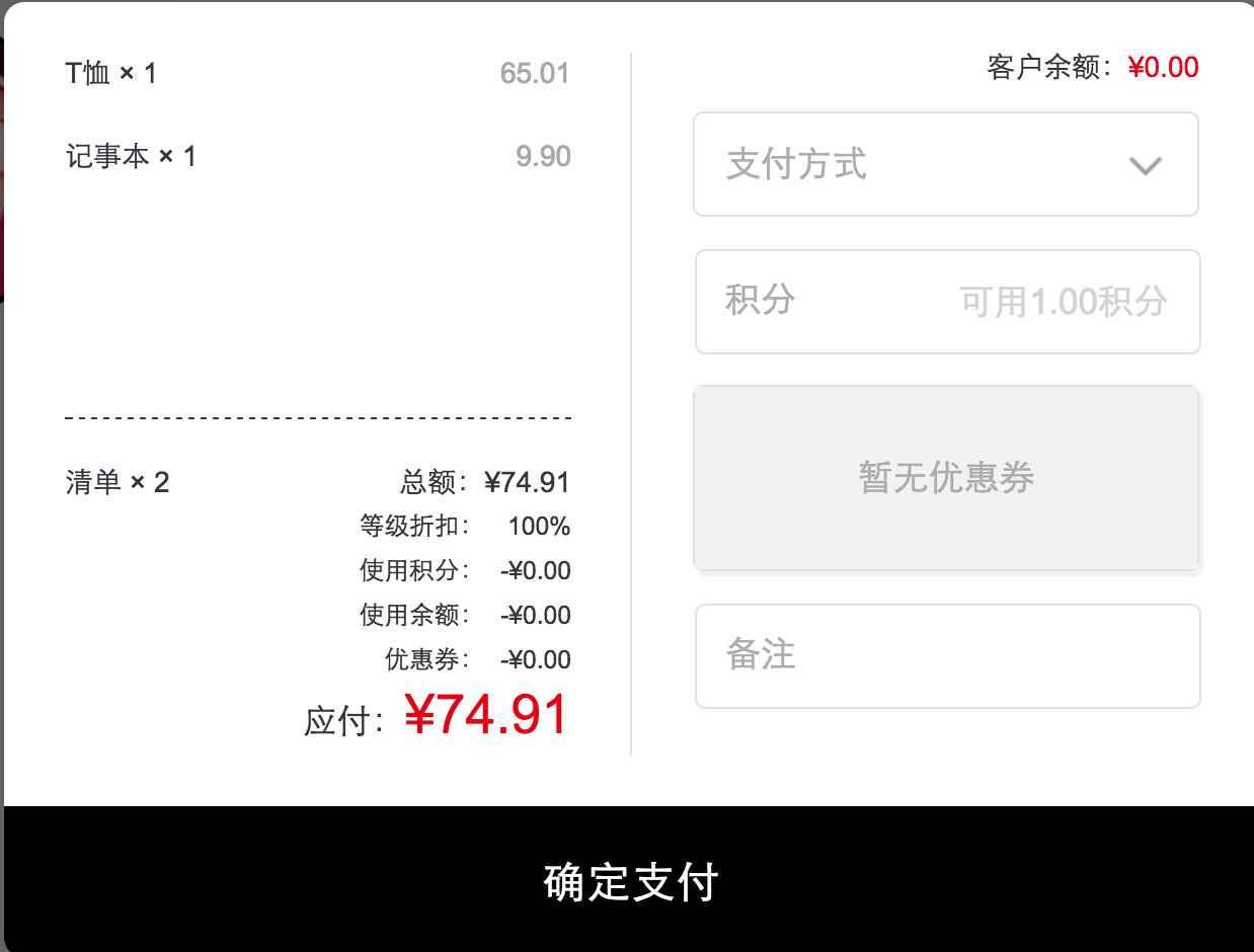 該頁面同樣可以選擇使用的優(yōu)惠券,積分使用以及付款方式可以選擇微信支付和現(xiàn)金支付,余額抵扣。