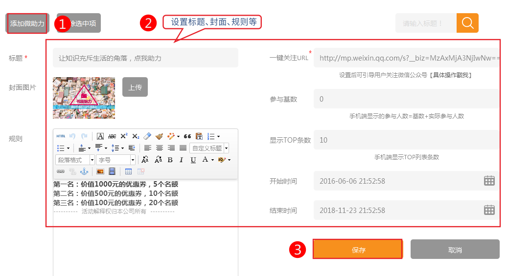 后臺(tái):可以添加多個(gè)助力活動(dòng),添加一鍵關(guān)注url(用來引導(dǎo)客戶關(guān)注公眾賬號(hào)),控制活動(dòng)開始和結(jié)束時(shí)間,設(shè)置參與基數(shù)。