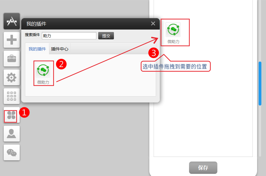 4.1 依次點(diǎn)擊插件-》我的插件-》選中“微助力”插件拖拽到您需要的位置。(如果“我的插件”中沒有,請(qǐng)到插件中心選啟用)