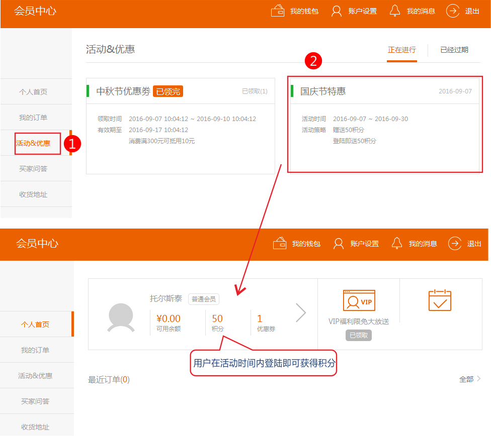 3.用戶在指定時(shí)間段登陸即可獲得 積分或優(yōu)惠劵