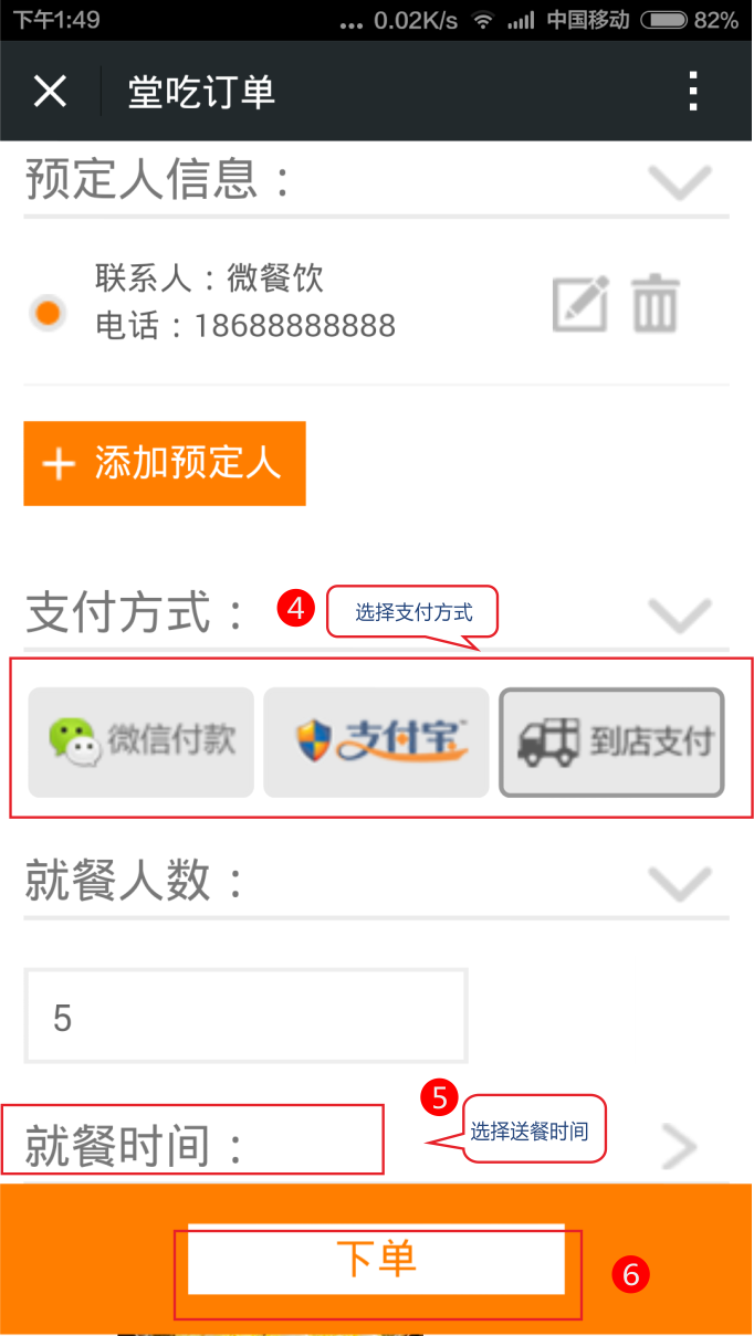 選擇支付方式,到店用餐時間