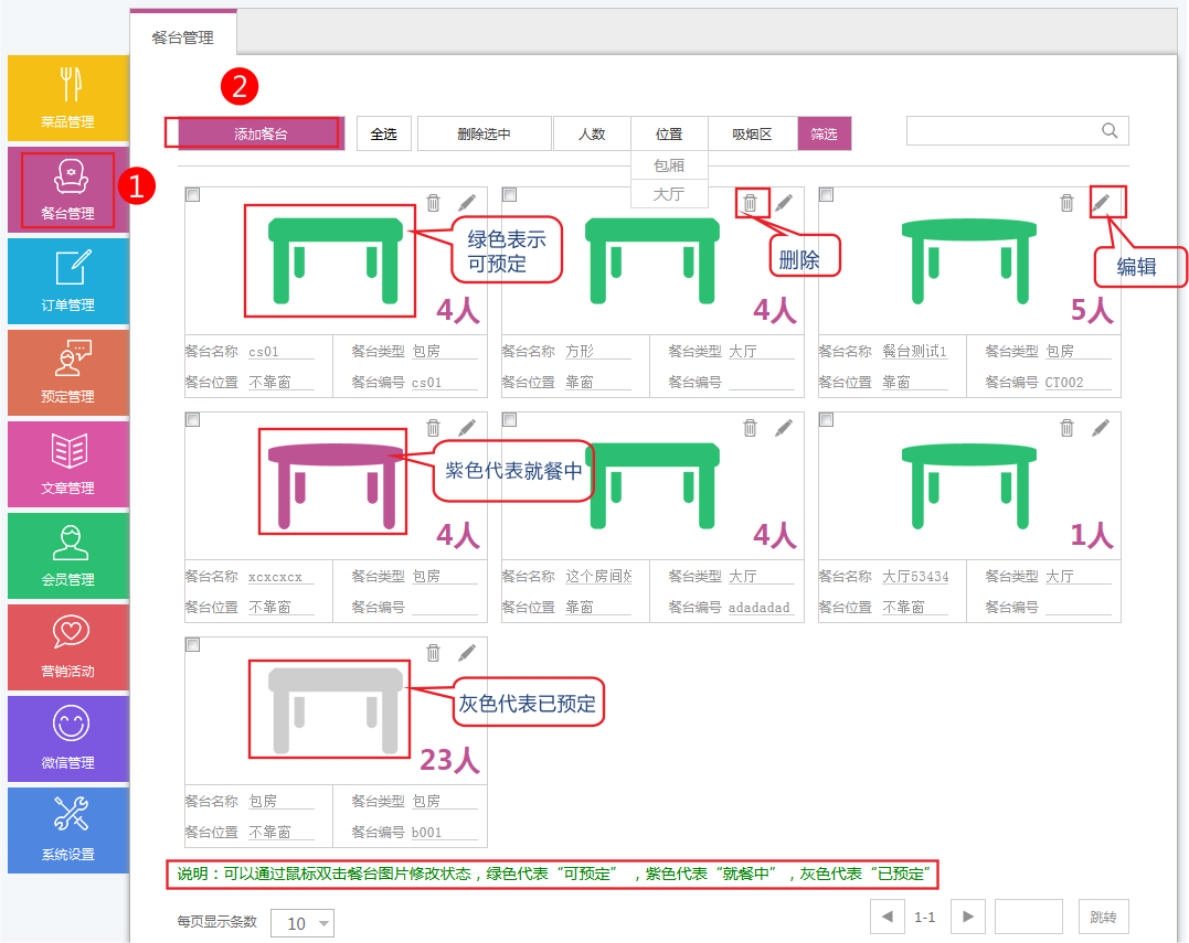注意:可以通過鼠標(biāo)雙擊餐臺圖片修改狀態(tài),綠色代表“可預(yù)定” ,紫色代表“就餐中”,灰色代表“已預(yù)定”