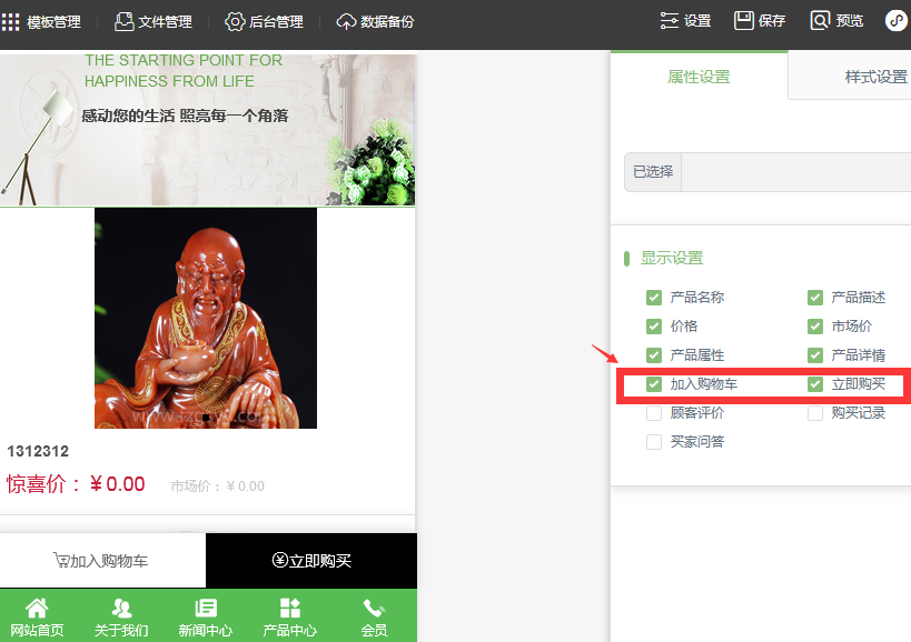 2、在前臺(tái)編輯頁(yè)面 產(chǎn)品詳情頁(yè) -》屬性設(shè)置中勾選 加入購(gòu)物車(chē)和立即購(gòu)買(mǎi)。保存重新下載app然后上傳到小程序發(fā)布即可。