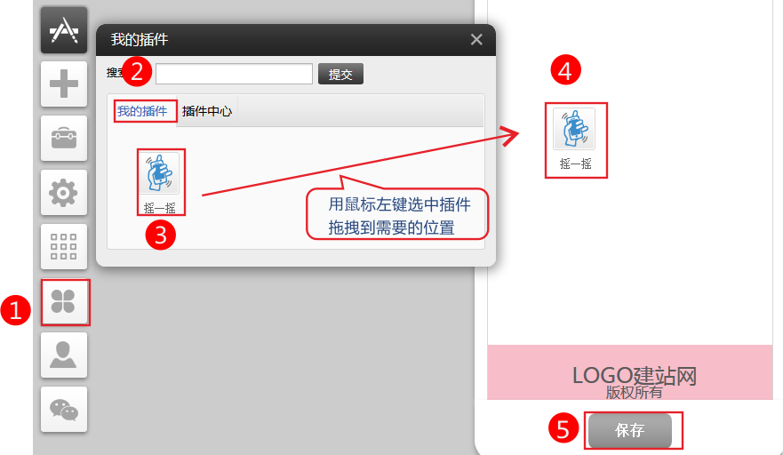 3、依次點擊插件-我的插件-選中“搖一搖”插件拖拽到您需要的位置。(如果“我的插件”中沒有,請到插件中心選啟用)