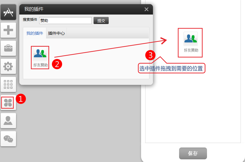 5.使用方法:進(jìn)入網(wǎng)站編輯-〉點左側(cè)插件圖標(biāo)-〉插件中心,找到好友贊助插件圖標(biāo),點啟用