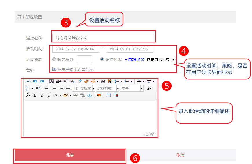 2、設(shè)置活動(dòng)名稱、時(shí)間、贈(zèng)送策略、是否在用戶領(lǐng)卡界面顯示,即可生成一個(gè)完整的開(kāi)卡即送活動(dòng)。