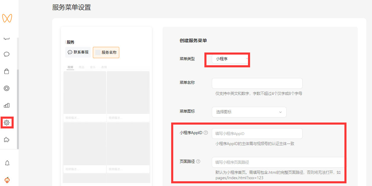 視頻號(hào)推出了服務(wù)菜單功能,只要是認(rèn)證的企業(yè)號(hào),可以添加客服和小程序任意頁面默認(rèn)為小程序首頁。需填寫包含.html的完整頁面路徑,否則將無法打開,如pages/index.html?xxx=123