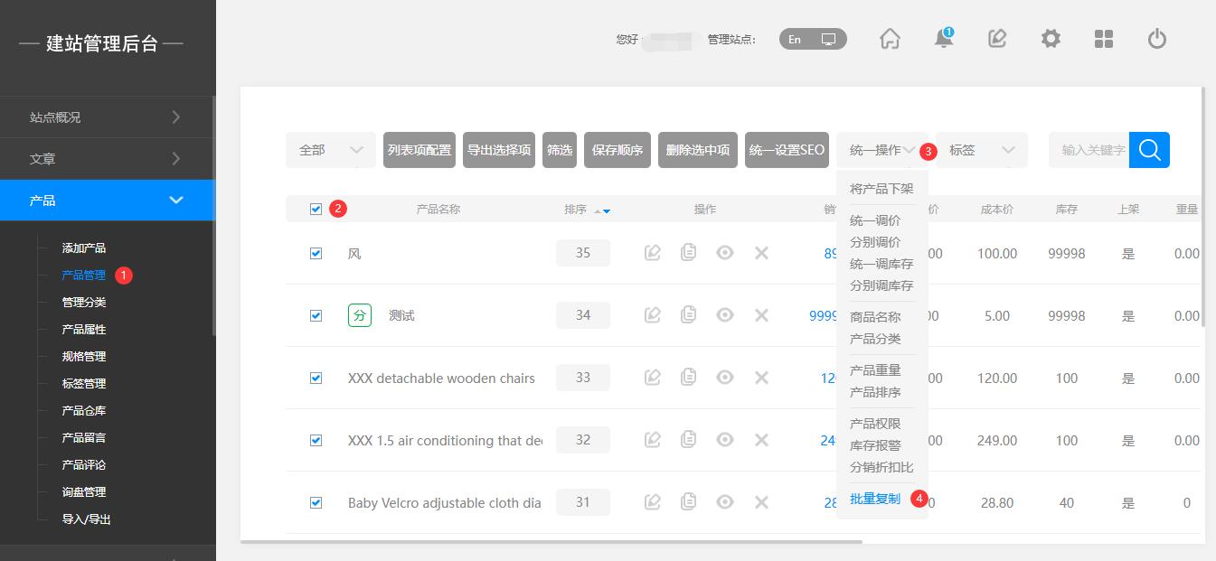 使用場景:不同的語言站點(diǎn)的產(chǎn)品,現(xiàn)在可以通過批操作統(tǒng)一復(fù)制后臺(tái):產(chǎn)品—產(chǎn)品管理—選擇產(chǎn)品—統(tǒng)一操作—批量復(fù)制—選擇語言站點(diǎn)