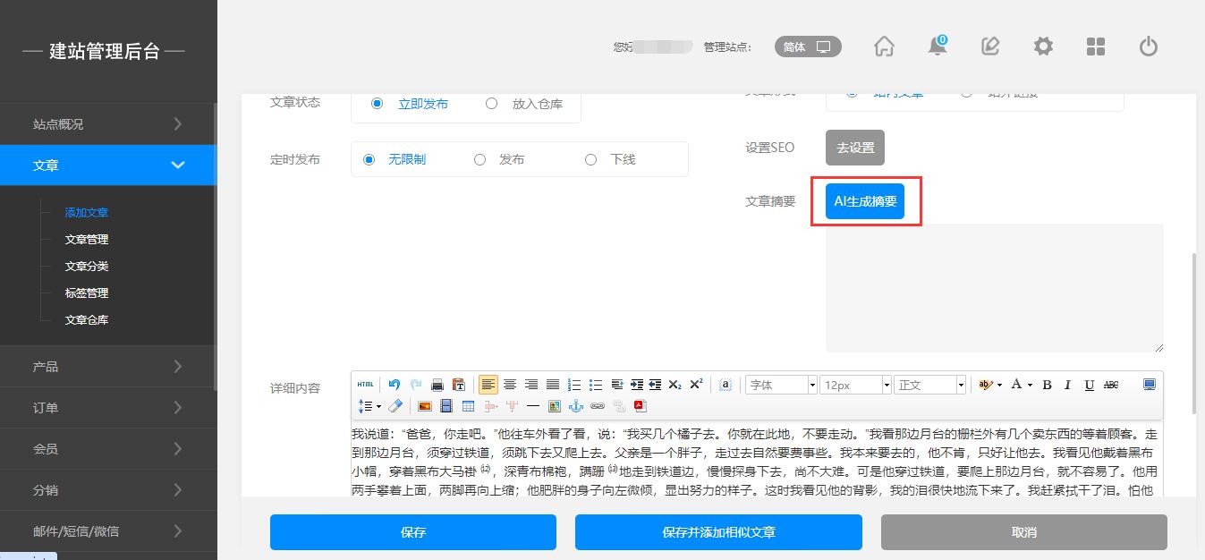 一、AI提取文章摘要(建站全版本)使用場景:使用AI快速提取文摘摘要,提高效率提示:必須要先填寫文章詳情內(nèi)容,才能使用AI提取摘要功能,AI使用次數(shù)是根據(jù)免費(fèi)的額度來定,超過需要單獨(dú)購買后臺(tái):添加文章—AI生成摘要二、AI提取SEOTKD功能(建站全版本)使用場景:使用AI智能提取SEO關(guān)鍵詞和描述提示:必須要先填寫文章詳情內(nèi)容,才能使用AI提取SEO功能,AI使用次數(shù)是根據(jù)免費(fèi)的額度來定,超過需要單獨(dú)購買后臺(tái):添加文章—SEO設(shè)置—AI自動(dòng)提取三、AI批量翻譯文章功能(基礎(chǔ)版、標(biāo)準(zhǔn)版、營銷版)