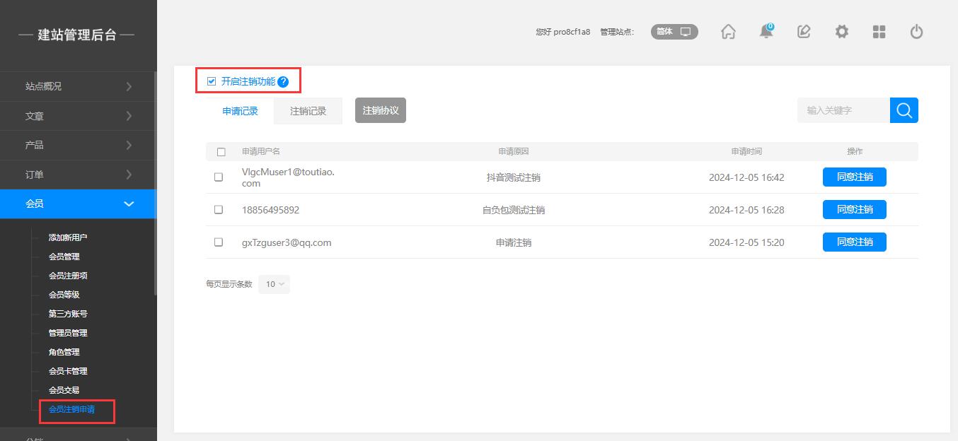 1.在建站后臺(tái),“會(huì)員”中新增了“會(huì)員注銷申請(qǐng)”菜單。(1)勾選后,會(huì)員中心會(huì)顯示出申請(qǐng)注銷按鈕。(2)可以設(shè)置注銷協(xié)議,用戶需要同意才能提交申請(qǐng),如圖所示:2.用戶可以在個(gè)人中心-賬戶設(shè)置中提交注銷申請(qǐng)。(不同版本的示意圖不一一展示了)3.在后臺(tái)可以查看注銷申請(qǐng)的基本信息。同意注銷后,該用戶的賬號(hào)即刪除(同意注銷操作不可撤銷)。可以在注銷記錄中查看已注銷的信息。