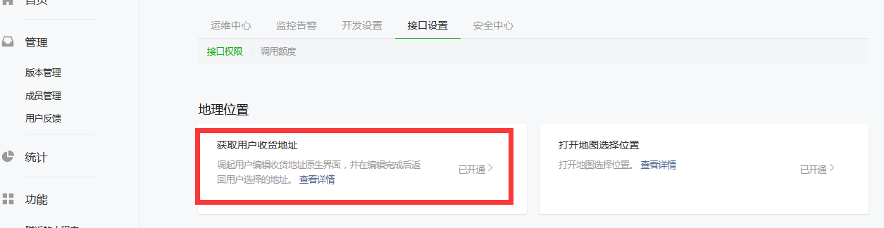 首先打開(kāi)https://mp.weixin.qq.com/登陸后依次點(diǎn)擊「開(kāi)發(fā)」-「開(kāi)發(fā)管理」-「接口設(shè)置」。如圖所示:獲取用戶收貨地址wx.chooseAddress:訂單地址管理獲取微信地址申請(qǐng)內(nèi)容按如下填寫(xiě)您好,客戶使用小程序時(shí)wx.chooseAddress:用于訂單地址管理獲取微信地址,望通過(guò),謝謝!
