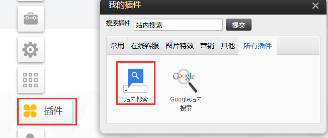 ?①.添加站內(nèi)搜索插件,選擇搜索框,點(diǎn)擊確定。②.點(diǎn)擊搜索結(jié)果設(shè)置③.選擇搜索結(jié)果形式-插件形式彈窗形式:搜索結(jié)果是以彈窗的形式展示(無(wú)需添加搜索結(jié)果頁(yè)面)插件形式:搜索結(jié)果是以頁(yè)面的形式展示(需要添加搜索結(jié)果頁(yè)面)注意:此教程重點(diǎn)介紹【插件形式】的設(shè)置方法,選擇了插件形式之后,需要設(shè)置文章搜索列表結(jié)果和產(chǎn)品搜索結(jié)果列表的鏈接。④.點(diǎn)擊下圖中的創(chuàng)建新頁(yè)面,系統(tǒng)將自動(dòng)創(chuàng)建一個(gè)帶有文章搜索結(jié)果插件或者產(chǎn)品搜索結(jié)果插件的頁(yè)面。創(chuàng)建后的模塊展示如下:⑤.也可以選擇在頁(yè)面管理中創(chuàng)建新頁(yè)面,再手動(dòng)放置產(chǎn)品搜索