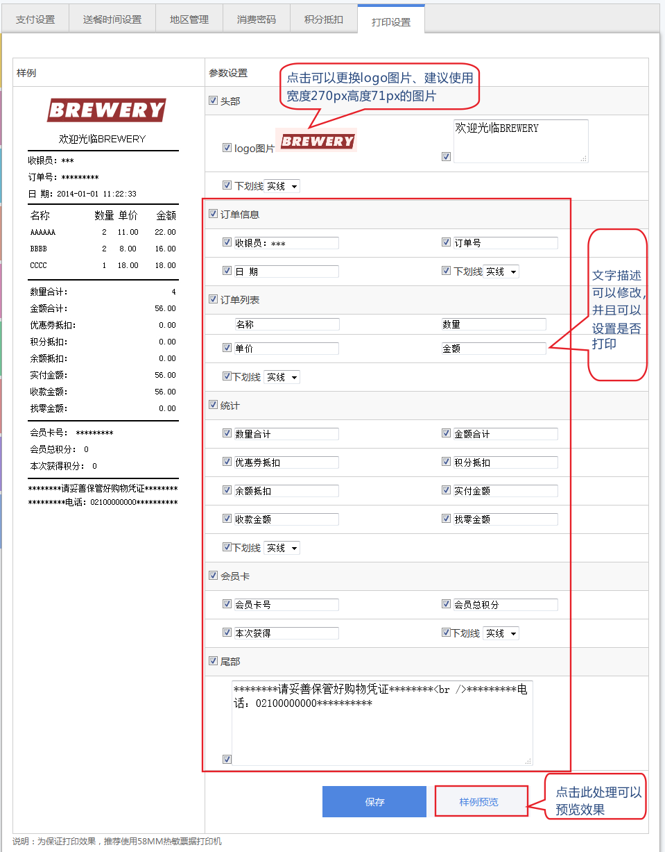 1、依次點(diǎn)擊系統(tǒng)設(shè)置-》打印設(shè)置 logo建議使用寬度270px高度71px的png圖片 說(shuō)明:為保證打印效果,推薦使用58MM熱敏票據(jù)打印機(jī)紙張大小建議使用58(48)*210mm 訂單打印 在訂單管理中找到需要打印的訂單后點(diǎn)擊打印圖標(biāo) 在新的瀏覽器窗口中彈出訂單詳情,核對(duì)無(wú)誤后點(diǎn)擊打印即可。