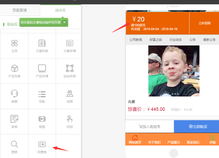 ①.插件庫,拖出優(yōu)惠券插件到編輯區(qū)域 ②.左側(cè)可以設(shè)置優(yōu)惠券的數(shù)據(jù)以及設(shè)置優(yōu)惠券樣式