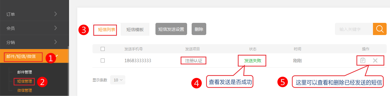 短信列表您可以通過短信列表已經(jīng)發(fā)送了的短信及是否發(fā)送成功。您還可以刪除已經(jīng)發(fā)送了的短信。依次點擊郵件/短信-》短信列表可以查看和刪除已經(jīng)發(fā)送的短信列表