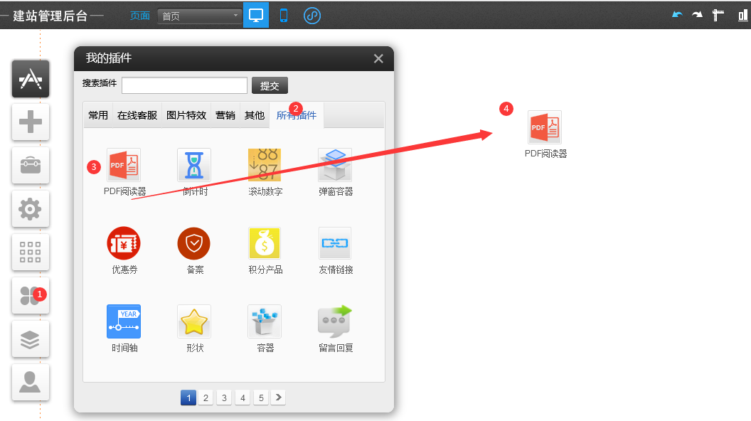 注意:僅Pc版建站支持,的PDF閱讀器最多展示8M大小的PDF文檔.(不支持ie瀏覽器)依次點擊插件-》所有插件-》選中PDF閱讀器拖拽到您需要的位置然后點擊設(shè)置選擇需要的pdf文件即可,也可以上傳新的pdf文件,注意不能超過8MB設(shè)置后效果如下插件功能菜單如下圖PDF文檔打開后的顯示名與文件名不一樣的處理具體請參考https://jingyan.baidu.com/article/925f8cb8b32fe5c0dde05601.html