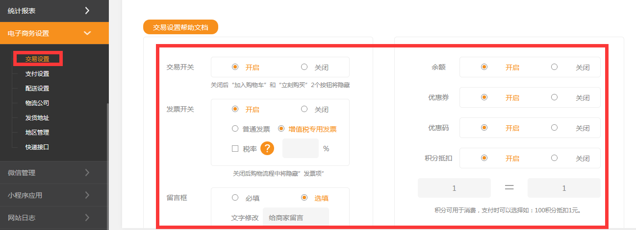 交易設(shè)置幫助文檔1.交易開關(guān)"交易開關(guān)"是控制前臺產(chǎn)品詳情頁面中"加入購物車"和"立刻購買"兩個按鈕是否顯示的操作,當選擇"開啟"則前臺頁面則會顯示該按鈕,若選擇"關(guān)閉"則會將按鈕"隱藏"。如圖所示:開啟后的狀態(tài)關(guān)閉后的狀態(tài)2.發(fā)票開關(guān)“發(fā)票開關(guān)”是指在提交訂單頁面中是否顯示支持用戶開具發(fā)票的選擇,當“開啟”后并選擇發(fā)票的種類“普通發(fā)票”或“增值稅發(fā)票”并保存后,前臺訂單提交頁面中將會顯示該內(nèi)容;若選擇“關(guān)閉”則將其隱藏,如圖所示:開啟后的狀態(tài)關(guān)閉后的