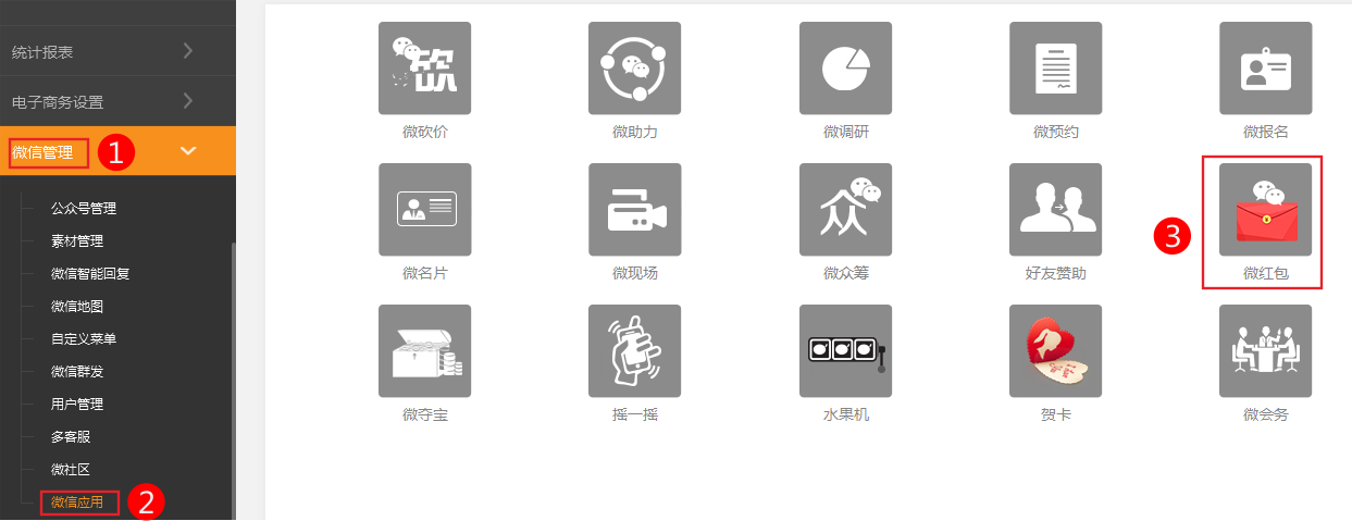 插件-微信紅包適用版本手機(jī)營(yíng)銷(xiāo)版本必須是認(rèn)證的服務(wù)號(hào)并開(kāi)通了微信支付功能。依次點(diǎn)擊微信管理-》微信應(yīng)用-》微信紅包一、紅包配置管理1.在微信公眾平臺(tái)->開(kāi)發(fā)都中心獲取Appid及AppSeret2.在微信支付商戶(hù)平臺(tái)帳戶(hù)中心-》帳戶(hù)設(shè)置-》api安全-》獲取證書(shū)文件,及設(shè)置商戶(hù)平臺(tái)api密鑰。3.通過(guò)獲取的信息進(jìn)行配置發(fā)送頻率規(guī)則 ◆ 每分鐘發(fā)送紅包數(shù)量不得超過(guò)1800個(gè); ◆ 北京時(shí)間0:00-8:00不觸發(fā)紅包贈(zèng)送;(如果以上規(guī)則不滿(mǎn)足您的需求,請(qǐng)發(fā)郵件至wxhongbao@tencent.com獲取升級(jí)指引)紅包規(guī)則 ◆ 單個(gè)紅包金額介于[1.00元,