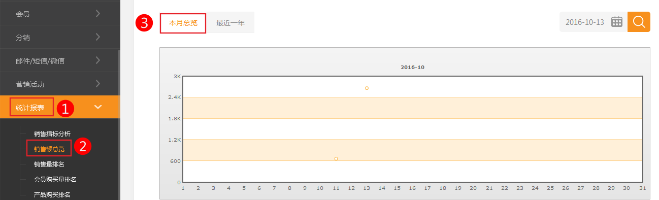 銷(xiāo)售額總覽可以按月或按日看銷(xiāo)售金額橙色的圓圈代表當(dāng)日的銷(xiāo)售金額。