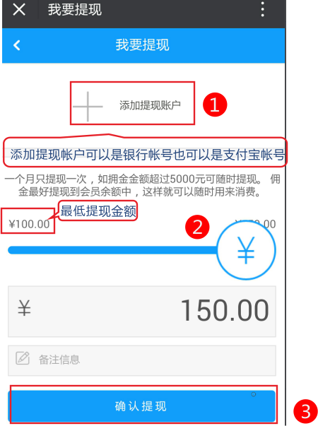 提現(xiàn)申請(qǐng)管理分銷(xiāo)商在網(wǎng)站進(jìn)行了申請(qǐng)?zhí)岈F(xiàn)的操作后,你在線(xiàn)下手動(dòng)打錢(qián)到該分銷(xiāo)商的賬戶(hù)中。最后到電腦的后臺(tái)提現(xiàn)申請(qǐng)管理中中找到該分銷(xiāo)商的提現(xiàn)申請(qǐng),點(diǎn)擊支付登陸確認(rèn)打款即可當(dāng)用戶(hù)達(dá)到最低提現(xiàn)金額后就可以申請(qǐng)?zhí)岈F(xiàn),先添加提現(xiàn)帳號(hào),然后確認(rèn)提現(xiàn)金額,然后確認(rèn)。2.支付登記中可以錄入提現(xiàn)金額,流水號(hào)及備注。3.支付登記后可以在提現(xiàn)記錄中查看支付時(shí)間和流水號(hào)
