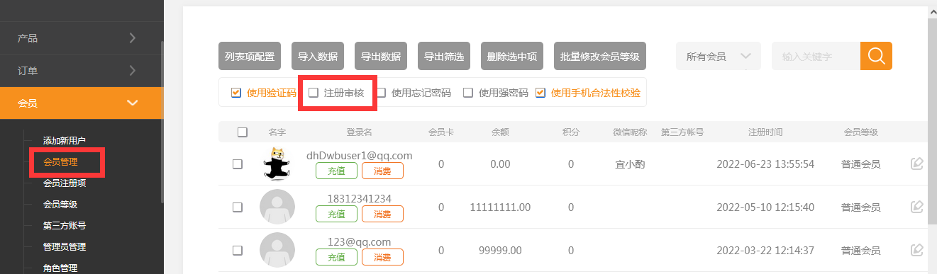 在網(wǎng)站后臺(tái)-》會(huì)員-》會(huì)員管理中開啟注冊(cè)審核(注意如果開啟了微信會(huì)員自動(dòng)注冊(cè)和小程序中訪問的客戶注冊(cè)審核是無效的)在用戶注冊(cè)時(shí)客戶訪問狀態(tài)是需要審核狀態(tài)