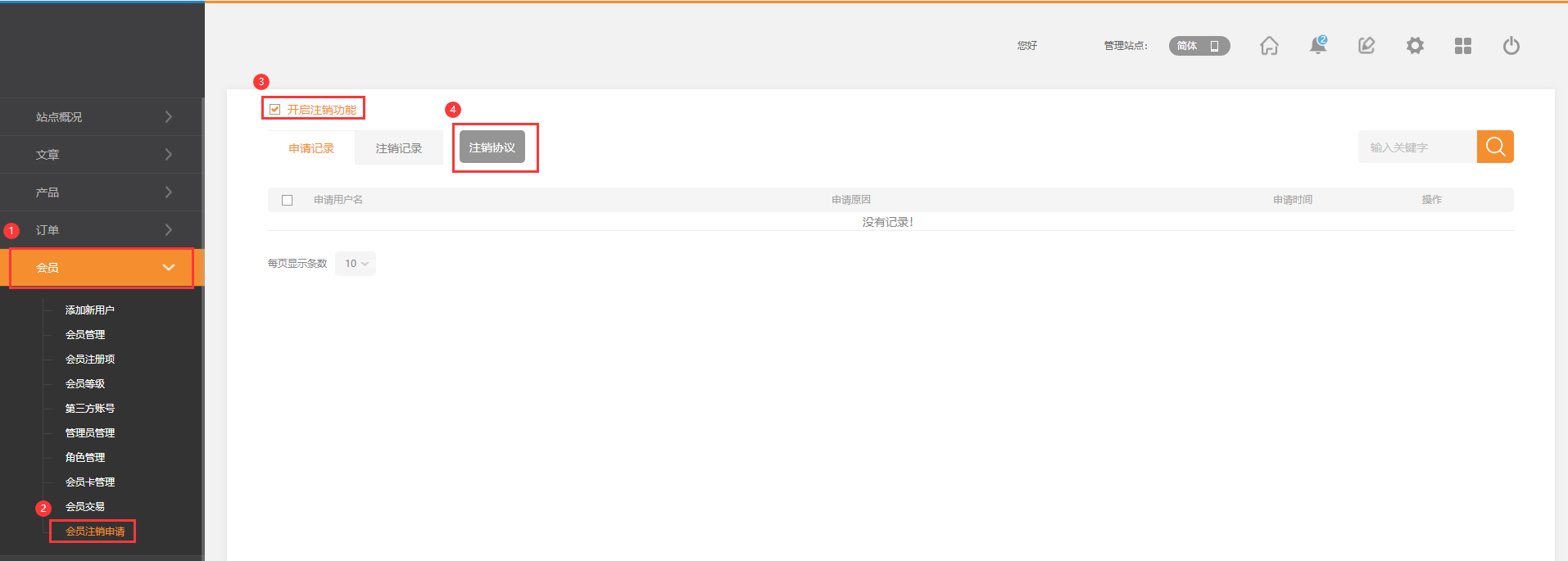 會(huì)員注銷申請(qǐng)使用場景:當(dāng)有些用戶已經(jīng)決定放棄自己的賬戶時(shí),為該類用戶提供注銷登錄的入口。注意:1.用戶提交注銷申請(qǐng)后需要管理員同意才能成功,同時(shí)該賬戶存在的積分,余額或者優(yōu)惠券等也會(huì)被清除。2.會(huì)員賬號(hào)注銷后是可以再申請(qǐng)注冊(cè)的,只是作為一個(gè)新的賬戶,與之前的賬戶任何沒有關(guān)系。1.會(huì)員——會(huì)員注銷申請(qǐng)——勾選開啟注銷功能2.添加會(huì)員注銷協(xié)議(該步驟可以省略)3.用戶前臺(tái)登錄會(huì)員賬號(hào)進(jìn)入會(huì)員中心:賬戶設(shè)置-申請(qǐng)注銷-填寫申請(qǐng)理由(選填)-同意協(xié)議-提交申請(qǐng)注意:后臺(tái)須開啟注銷功能后,前臺(tái)的申請(qǐng)注銷才能顯示,否則不
