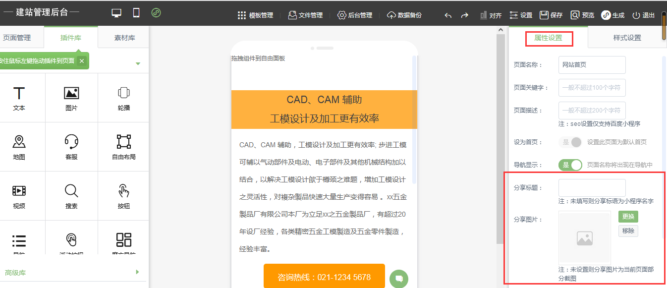 在頁面屬性中設(shè)置分享標(biāo)題和分享圖片如下圖:如果不設(shè)置則分享圖片為當(dāng)前頁面部份截圖。