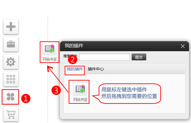PC版插件(適用版本基礎版、標準版、營銷版)1、依次點擊插件-我的插件-選中“網(wǎng)站書簽”插件拖拽到您需要的位置。(如果“我的插件”中沒有,請到插件中心選啟用)2、點擊設置,配置網(wǎng)站書簽的樣式。“設為首頁”和“加入收藏”文字可以更改。選擇框取消勾選后該項目將不顯示。選擇文字的字體設置顯示文字的大小點擊可以設置文字的顏色設置是否加粗顯示設置下劃線設置斜體3、設置后效果如下4、最后記得在右上角點擊保存。