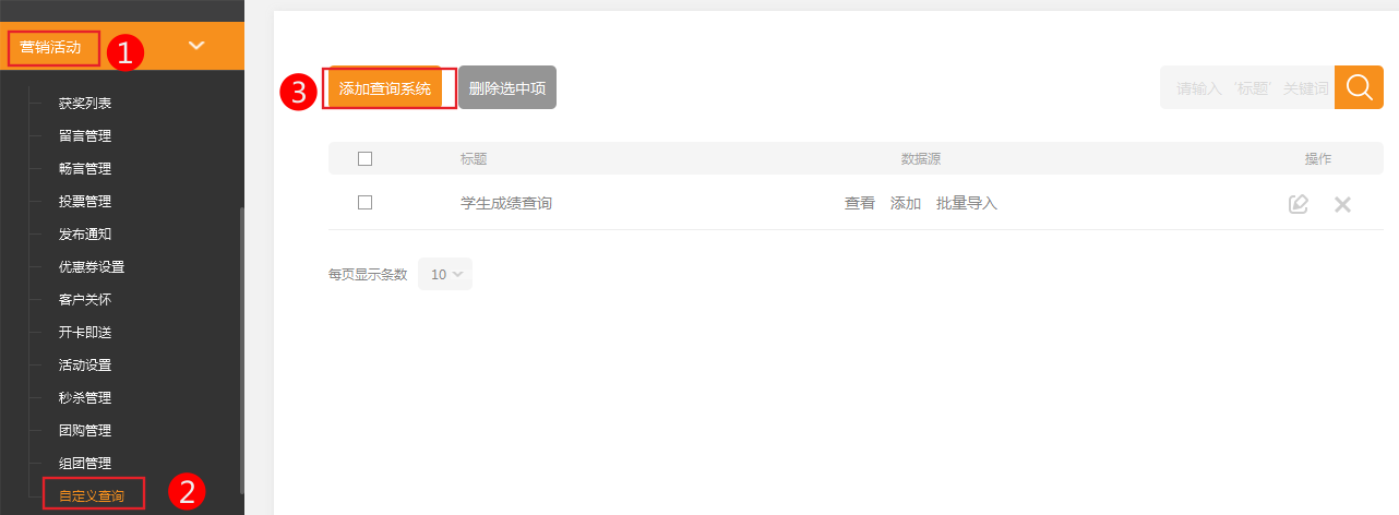 視頻指導講解:適用版本PC營銷版手機營銷版1.自定義查詢是一個完全支持個性化定制內(nèi)容的查詢插件,該插件操作簡單,功能強大,通過使用該插件您可以在自己的網(wǎng)站中展現(xiàn)任何形式的查詢?nèi)肟谝苑奖阍L問者使用。2.適用版本(PC營銷版+手機營銷版)查詢結(jié)果如果選擇“列表”則是模糊匹配,如果選擇“文本”則是精確匹配使用示例例如:防偽查詢,代理商資格查詢、學生成績查詢等查詢相關的事情都可以用這個客戶可以自己添加字段并可以批量導入相關數(shù)據(jù)查詢結(jié)果也可以自定義添加查詢系統(tǒng)數(shù)據(jù)源也支持圖片上傳查詢中可以看到結(jié)果中帶有圖片添加后