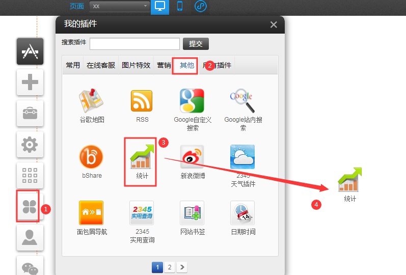 PC和手機版插件(適用版本基礎(chǔ)版、標準版、營銷版)瀏覽數(shù)據(jù)統(tǒng)計1、操作步驟如下:在左側(cè)插件-》其它-》點擊拖拽“統(tǒng)計”插件到需要的位置2.設(shè)置選擇百度統(tǒng)計谷歌統(tǒng)計等,并輸入相應(yīng)代碼。(統(tǒng)計類型和統(tǒng)計代碼必須一致否則無效)(代碼請自行到相關(guān)統(tǒng)計網(wǎng)站注冊賬號申請,如百度統(tǒng)計,這里填入統(tǒng)計代碼即可)提示:統(tǒng)計代碼必須與統(tǒng)計類型保持一致,否則無效3.1,勾選設(shè)置為頁腳元素,這樣所有使用頁腳的頁面都可以顯示了。3.2您也可以直接把統(tǒng)計模塊加在底版中,使用了底版的頁面這樣就可以統(tǒng)計到了。4.保存后預覽即可注意:最新版本的