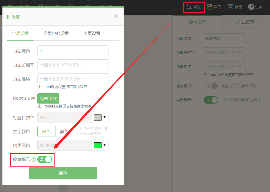 1.在小程序編輯器中,點擊設(shè)置,新增了收藏提示的設(shè)置項。若打開,則訪問者第一次進(jìn)入小程序時會看到收藏提示,如圖所示: