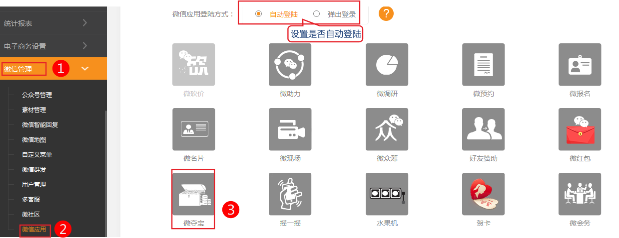 適用版本手機(jī)營銷版本微信帳號類型認(rèn)證的服務(wù)號并且需要開通支付功能。微信端無需注冊即可直接登錄當(dāng)活動結(jié)束時,參與人數(shù)沒有達(dá)到設(shè)置的人次,系統(tǒng)不會開獎,但管理員可以在后臺手動開獎1、依次點擊微信管理-》微信應(yīng)用-》微奪寶-》添加微奪寶可以用積分和優(yōu)惠劵2、錄入活動詳情微信公眾號一鍵關(guān)注頁面制作及鏈接獲取方式3、依次點擊插件-我的插件-選中“微奪寶”插件拖拽到您需要的位置。(如果“我的插件”中沒有,請到插件中心選啟用)3、選擇數(shù)據(jù)來源,并設(shè)置樣式。用戶點擊參與奪寶時會生成訂單,并要求參與者錄入收貨地址。商家發(fā)貨